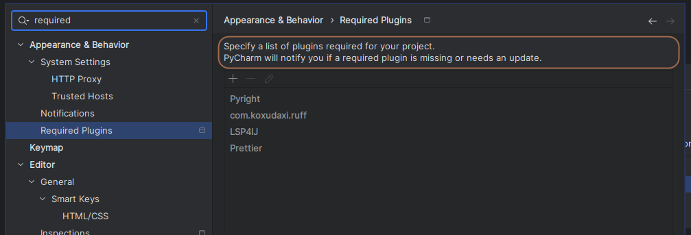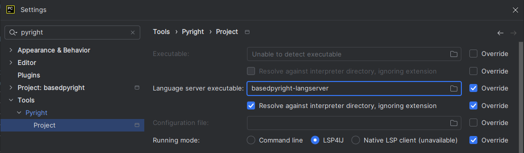 we recommend configuring these settings as overrides in the "Appearance & Behavior > Required Plugins" menu, and configuring the pyright plugin (and LSP4IJ if using pycharm community) as a recommended dependency: